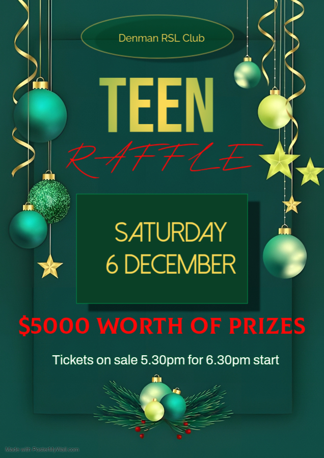 Denman RSL Club Teen Raffle $5000 worth of prizes to be won. Apple Watches, TV, Playstation, Laptop and much more. Back to Community Events Advertisement Date Dec 06 2025 Expired! Time 5:30 pm - 8:00 pm Share this event