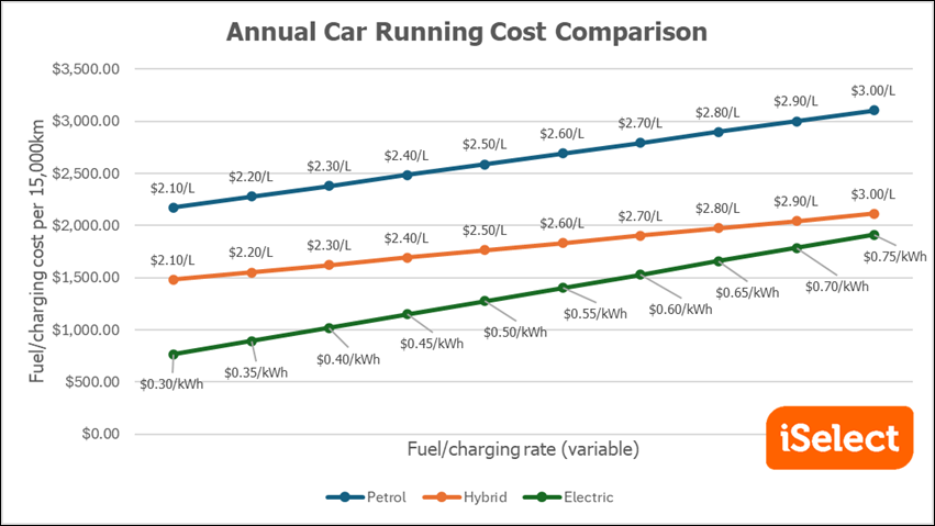 Annual running costs based on assumed varying fuel and energy rates, using claimed vehicle consumption figures. Source: iSelect